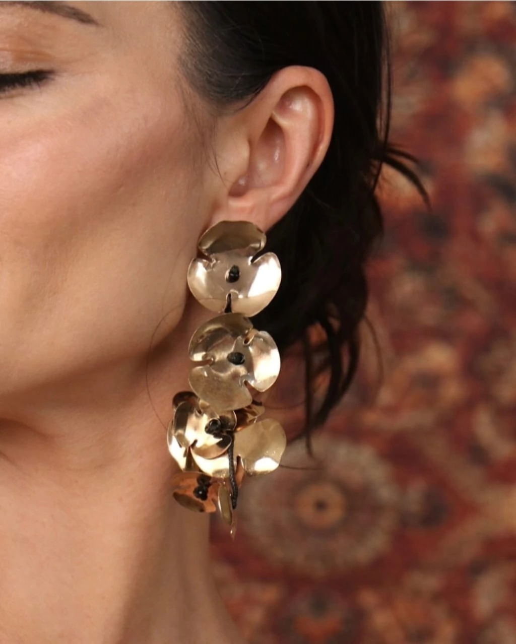 Brinco leve com camadas de flores de metálicas douradas de tamanho variado em fio encerado.