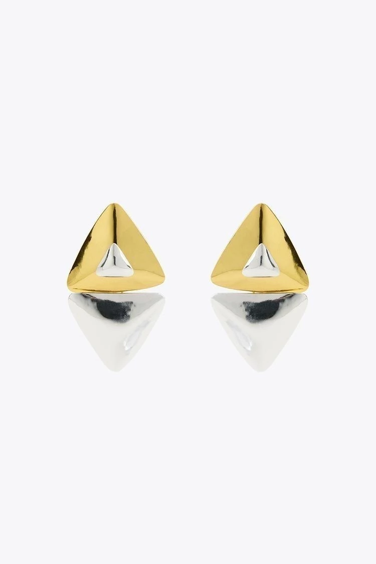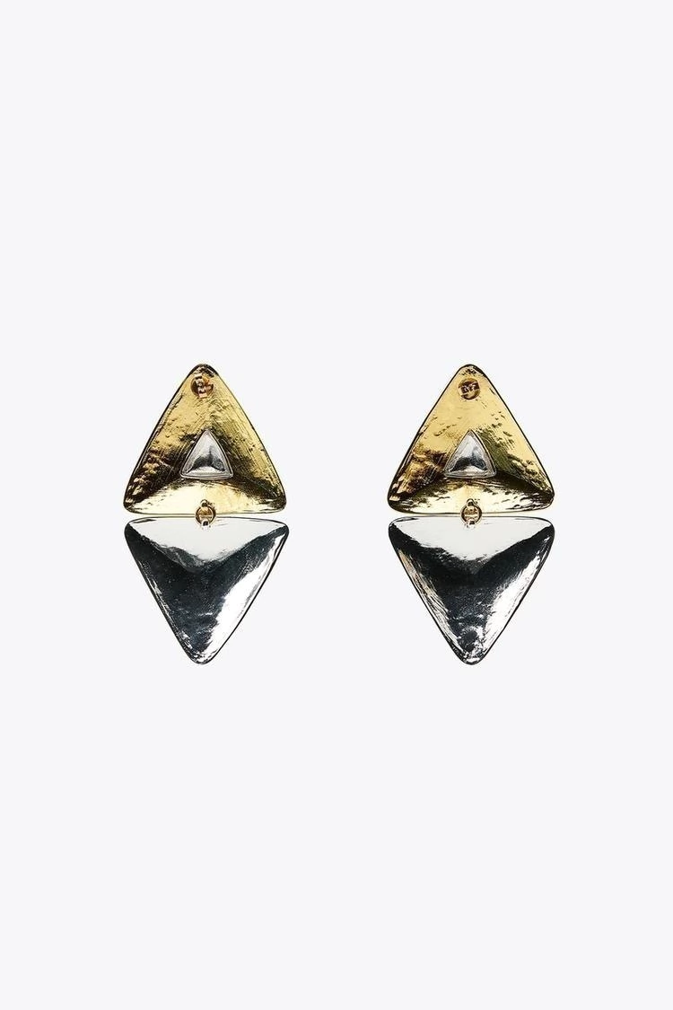 Brinco geométrico de metal com mix de banhos dourado e prata.