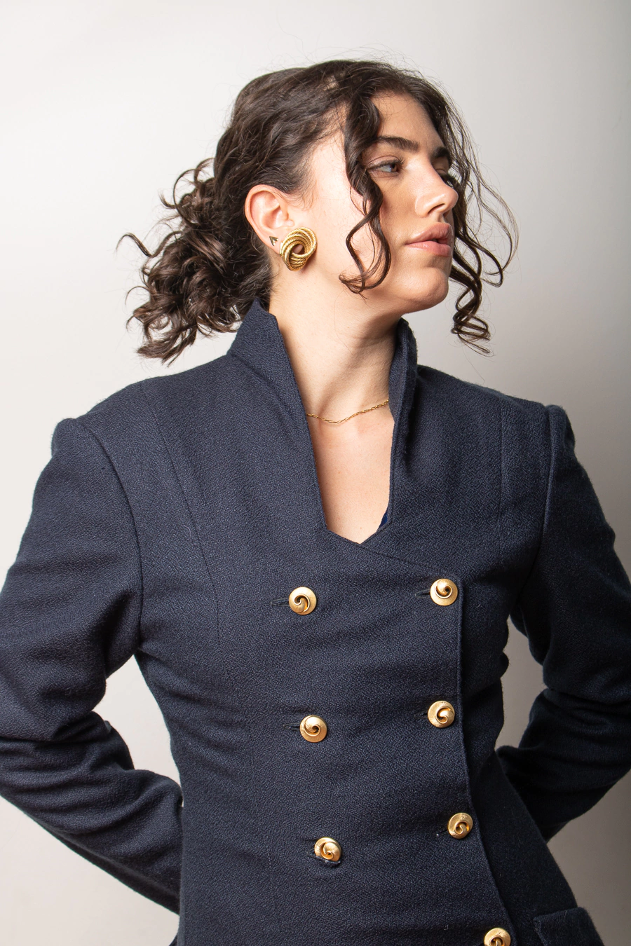 Casaco/vestido longo vintage com corte exuberante com gola e punhos diferenciados, lindos botões oringiais, saia bem rodada. O tecido parece ser uma lã fina na cor azul marinho. Todo forrado.