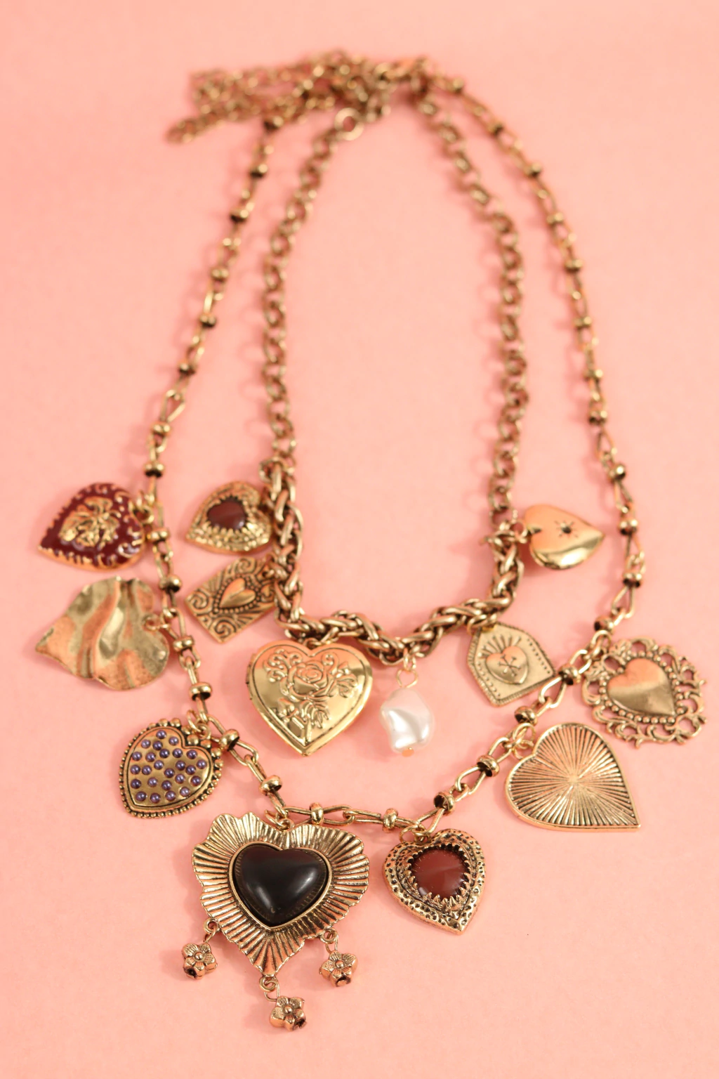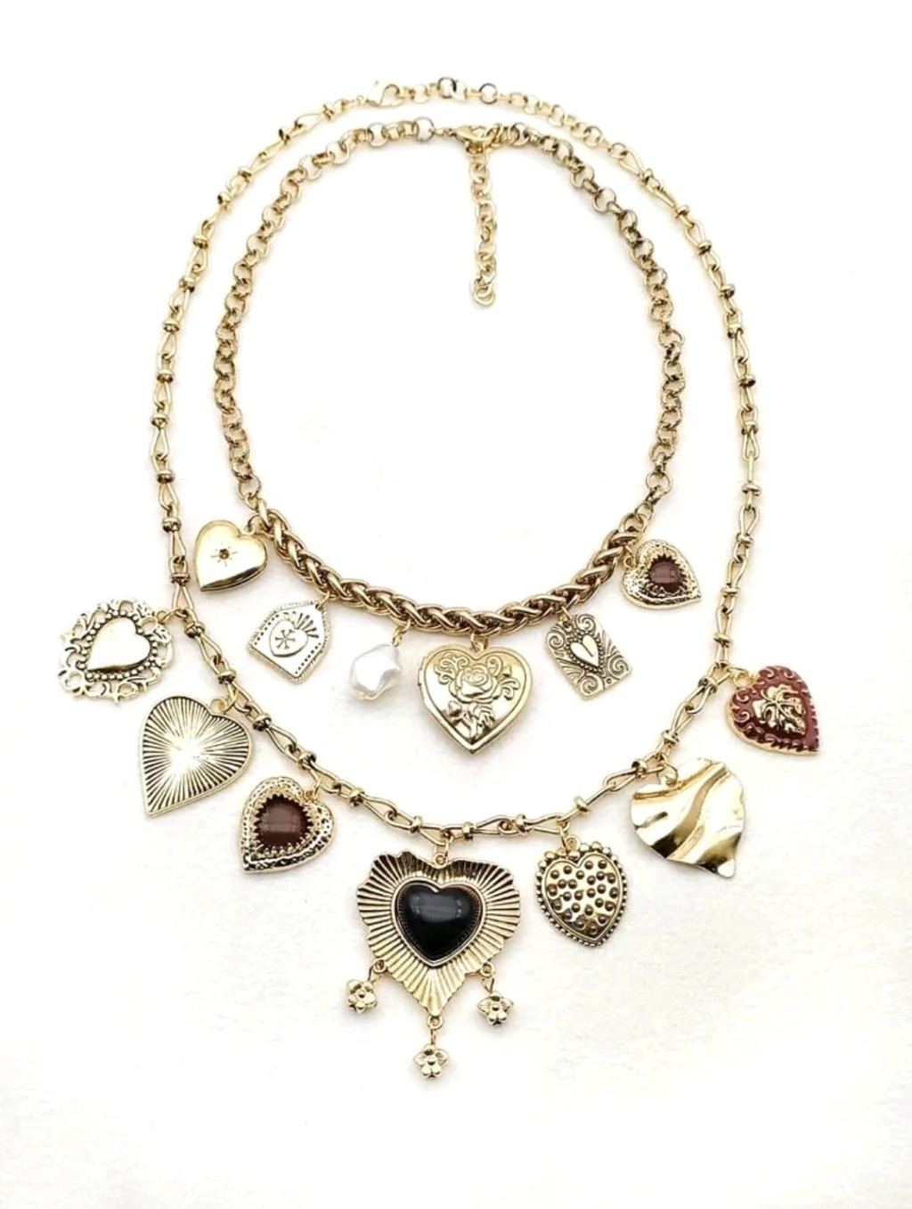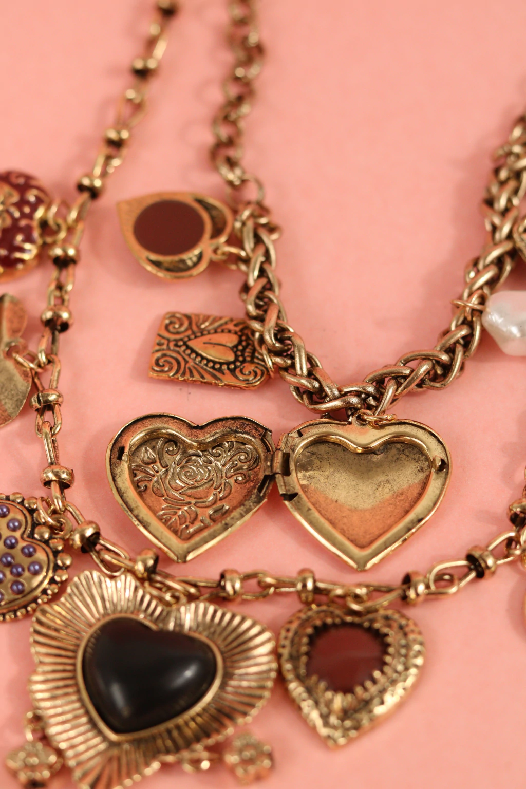 Colar duplo de metal dourado vintage com pingentes de corações e 2 relicários.
