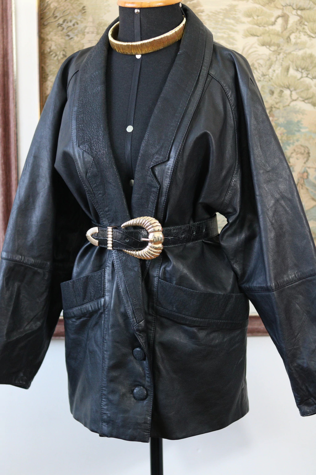 Jaqueta de couro anos 80 deslumbrante! Corte incrivel, com modelagem alongada cheia de detalhes, gola dupla, couro texturizado, mangas soltinhas, bolsos, toda forrada. Impecável! Peça já higienizada e hidratada!