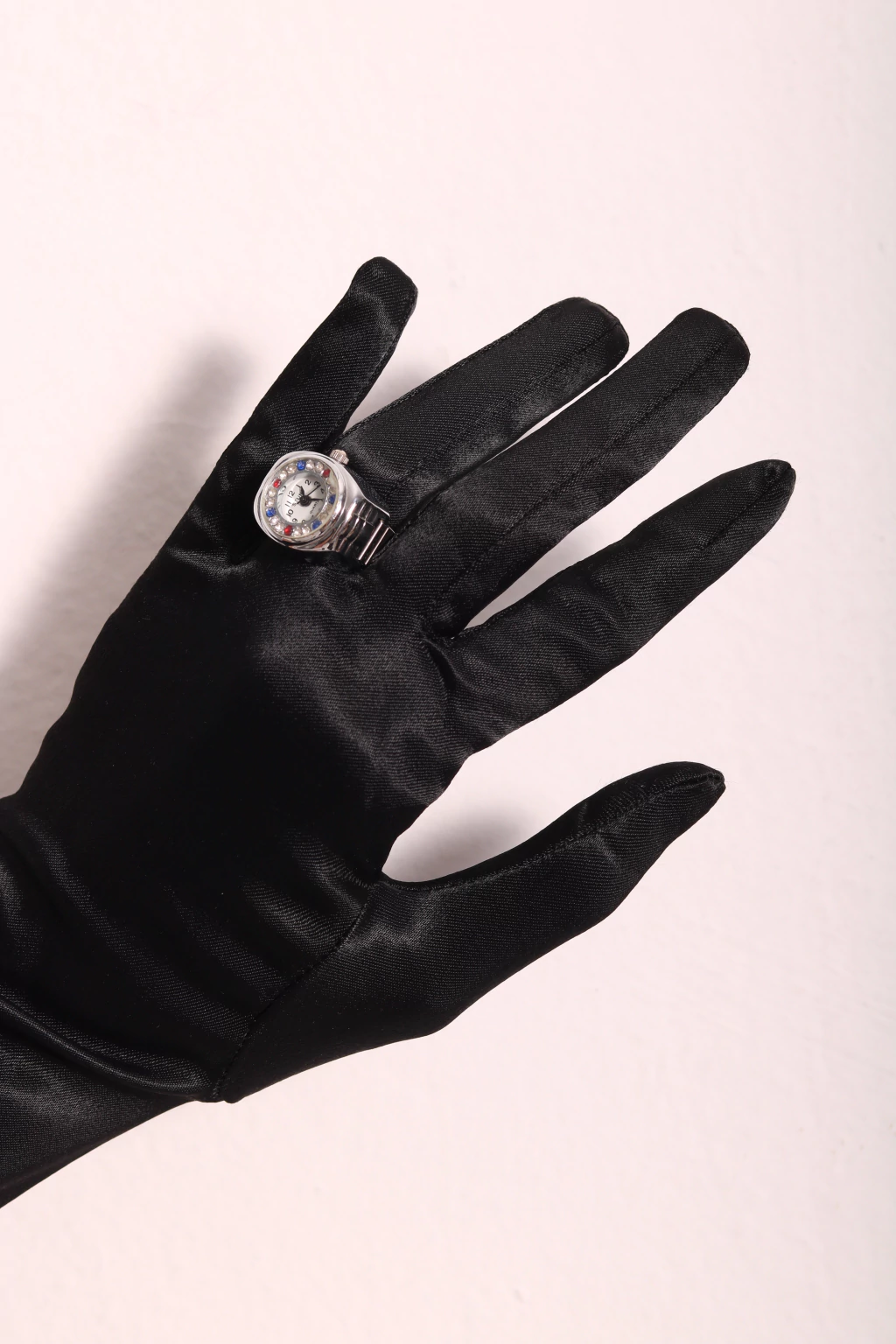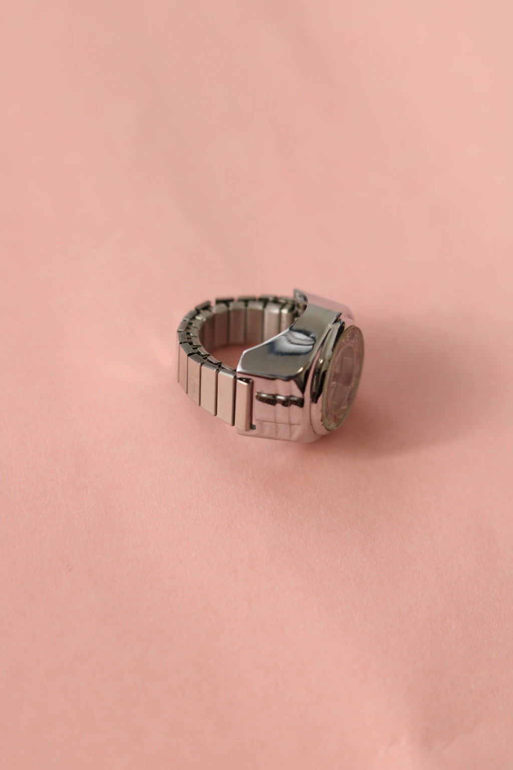Relógio anel anos 90 de metal prateado com detalhes de strass e "pulseira" elástica. Peça revisada e com bateria nova.