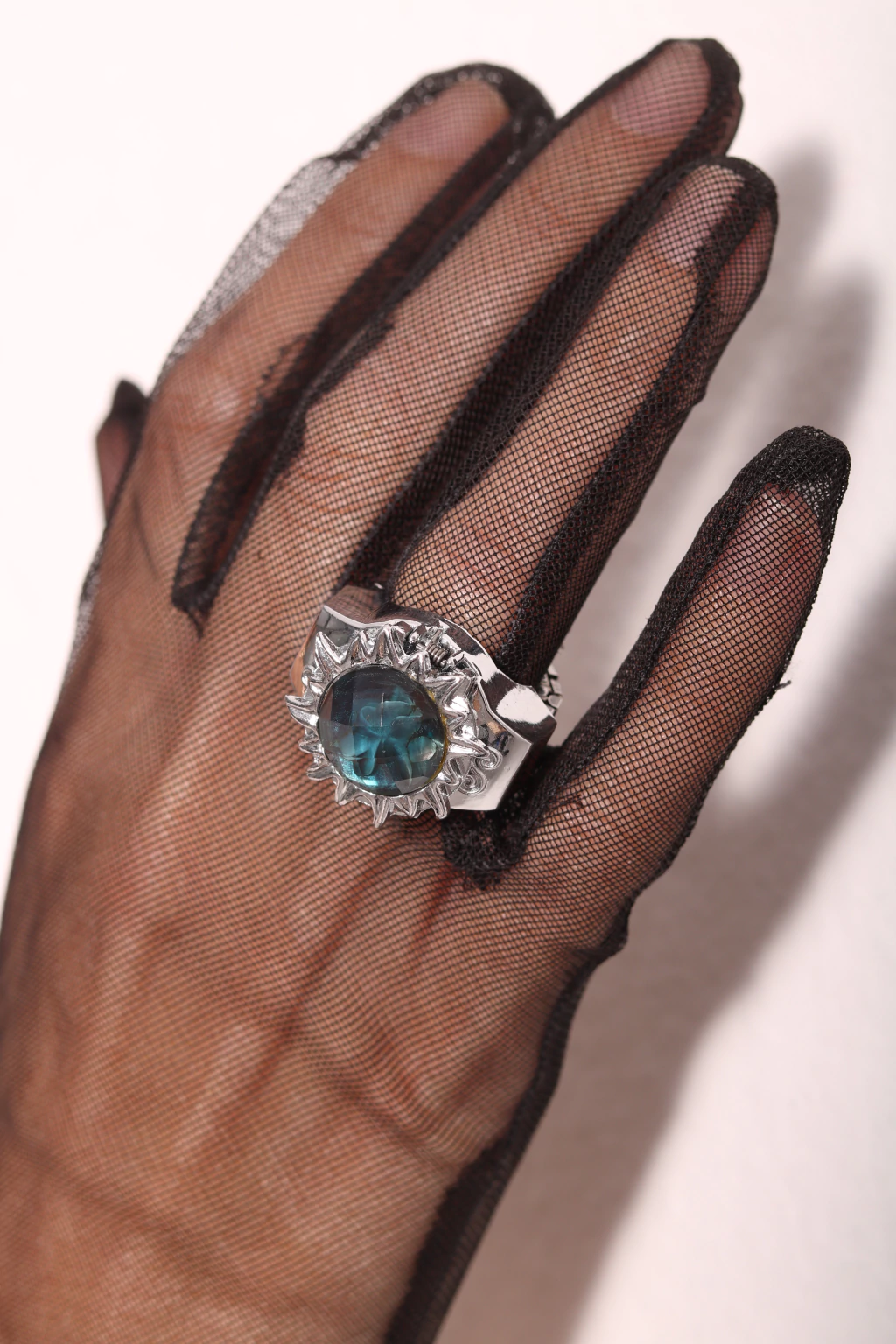 Relógio anel anos 90 de metal prateado com "pulseira" elástica e pedra de resina azul. Peça revisada e com bateria nova.